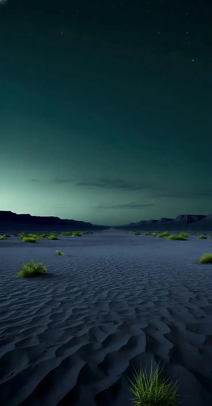 A vast flat desert stretches to distant mesa cliffs under a hauntingly beautiful deep teal [...]