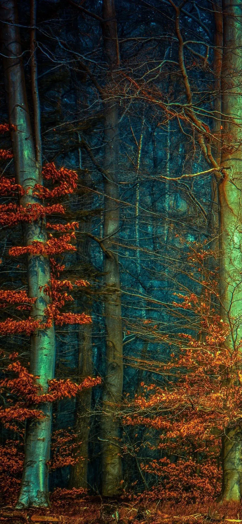 A hauntingly beautiful forest scene where rust-red autumn leaves cling to dark trunks bathed in [...]