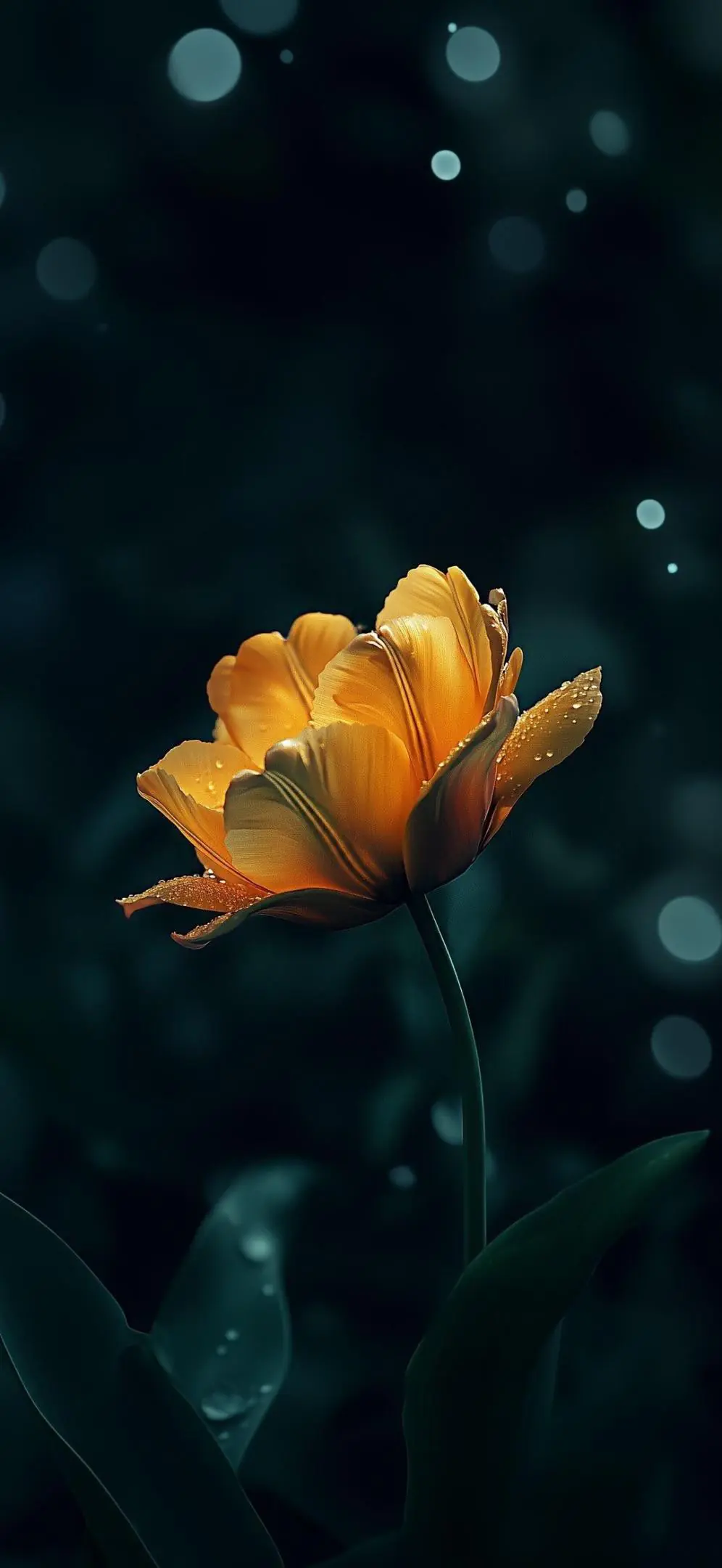 A single luminous golden-orange tulip with dew-kissed petals glows against a deep dark teal background [...]