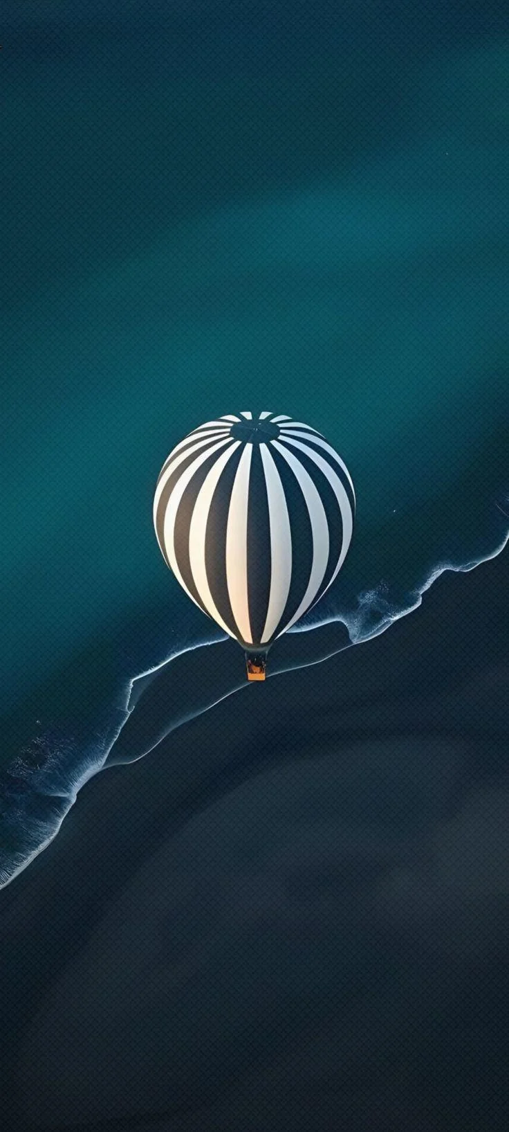 A bold black-and-white striped hot air balloon floats serenely above a dramatic aerial view of [...]