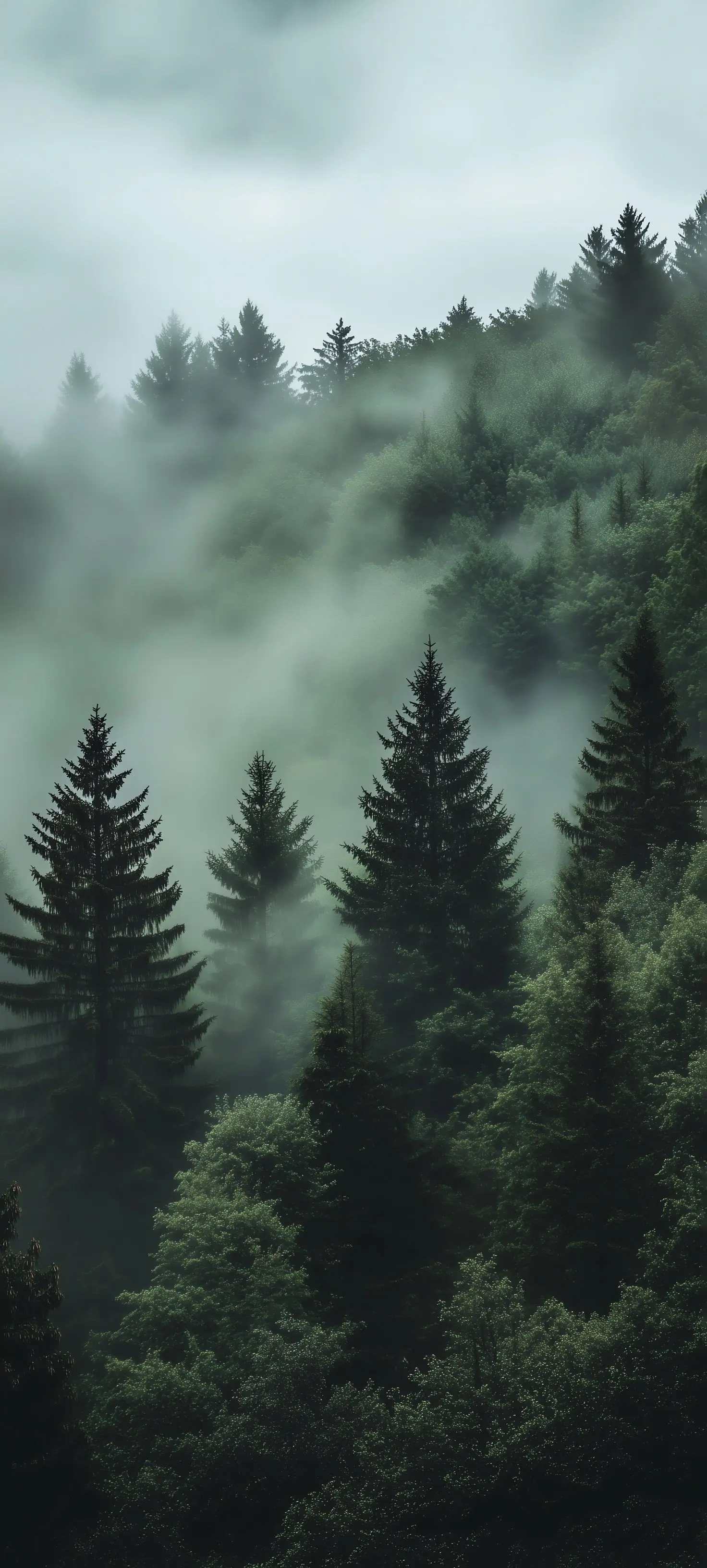 A lush green pine forest cloaks a steep hillside as thick white mist weaves dramatically [...]