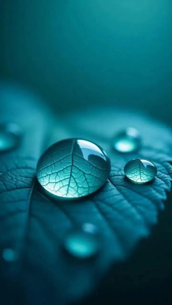 Two perfect transparent water droplets rest on a teal-green leaf, each acting as a magnifying [...]