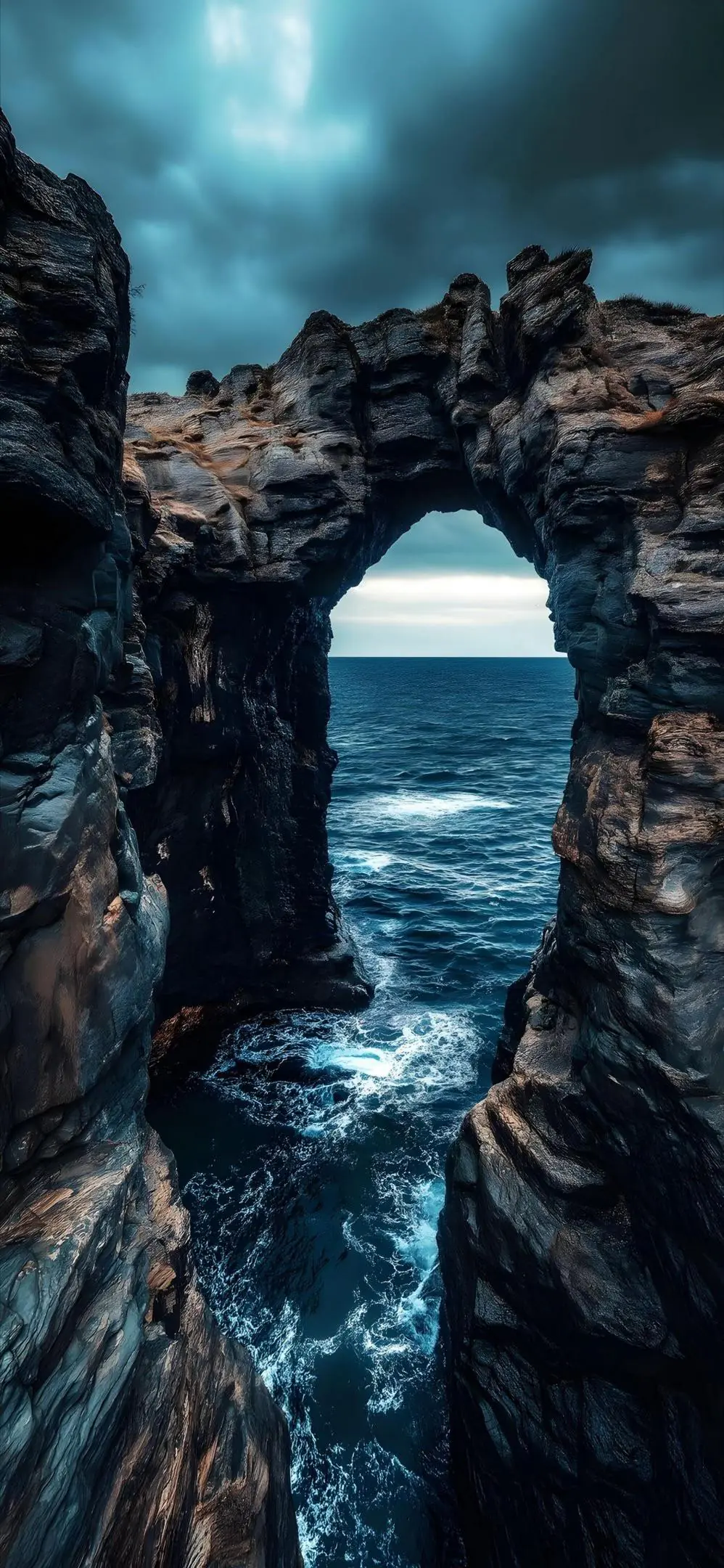 A massive natural rock arch spans a churning dark ocean [...]