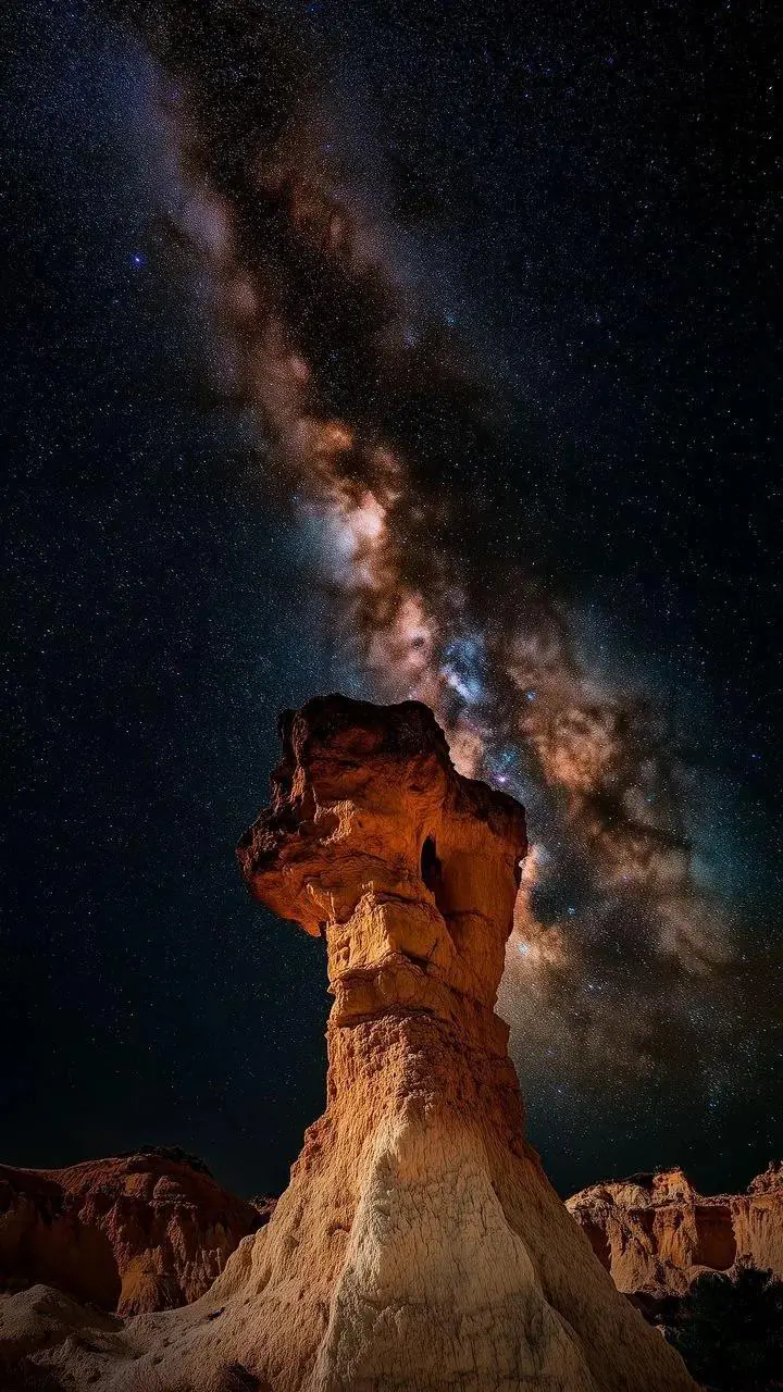 A dramatically lit orange sandstone hoodoo rock formation rises from [...]