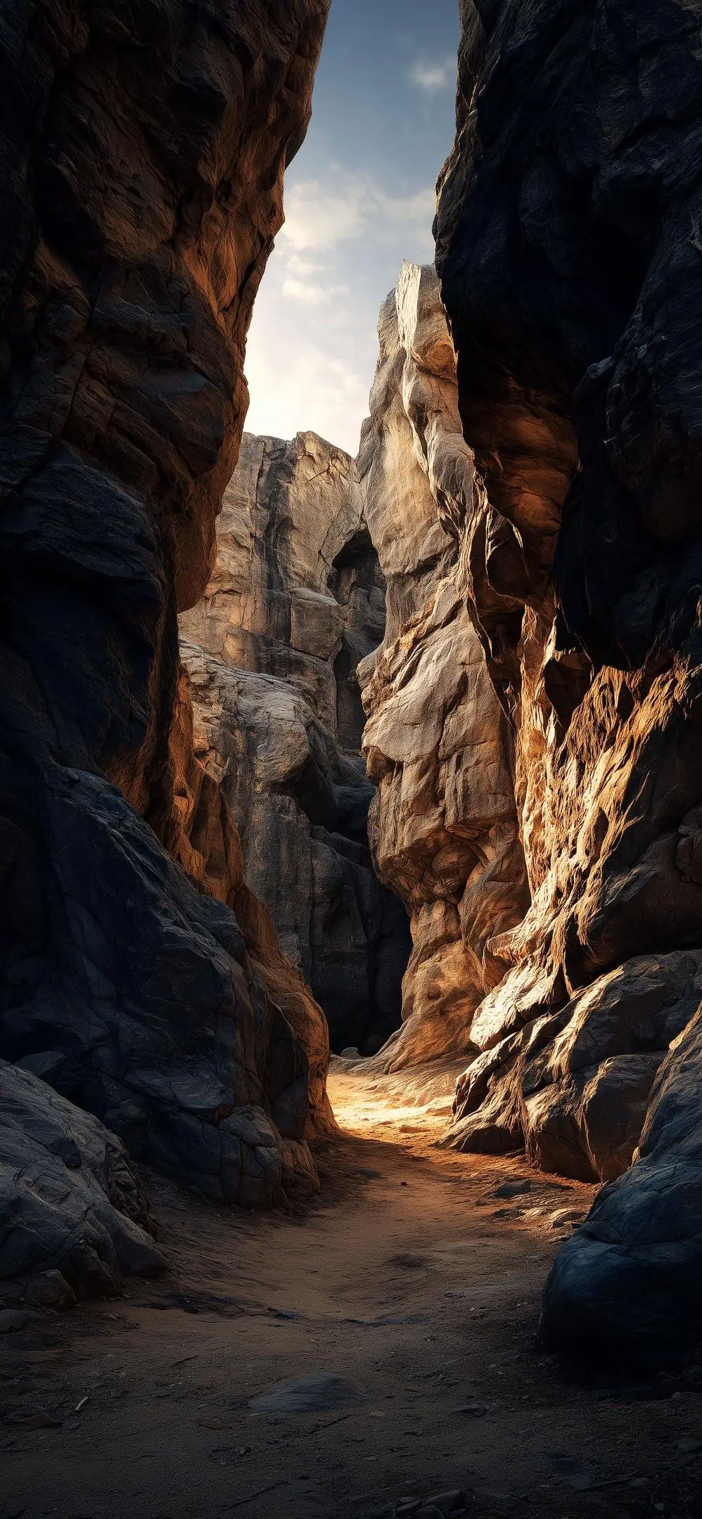 A winding sandy path cuts through a dramatic slot canyon, [...]