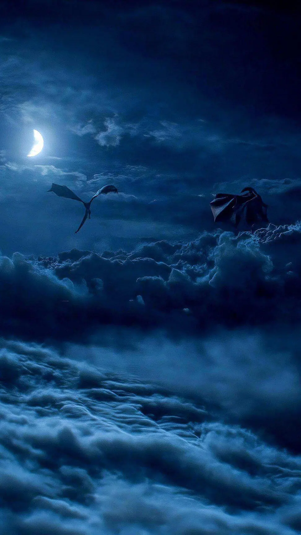 Two dark dragon silhouettes soar above a roiling sea of [...]
