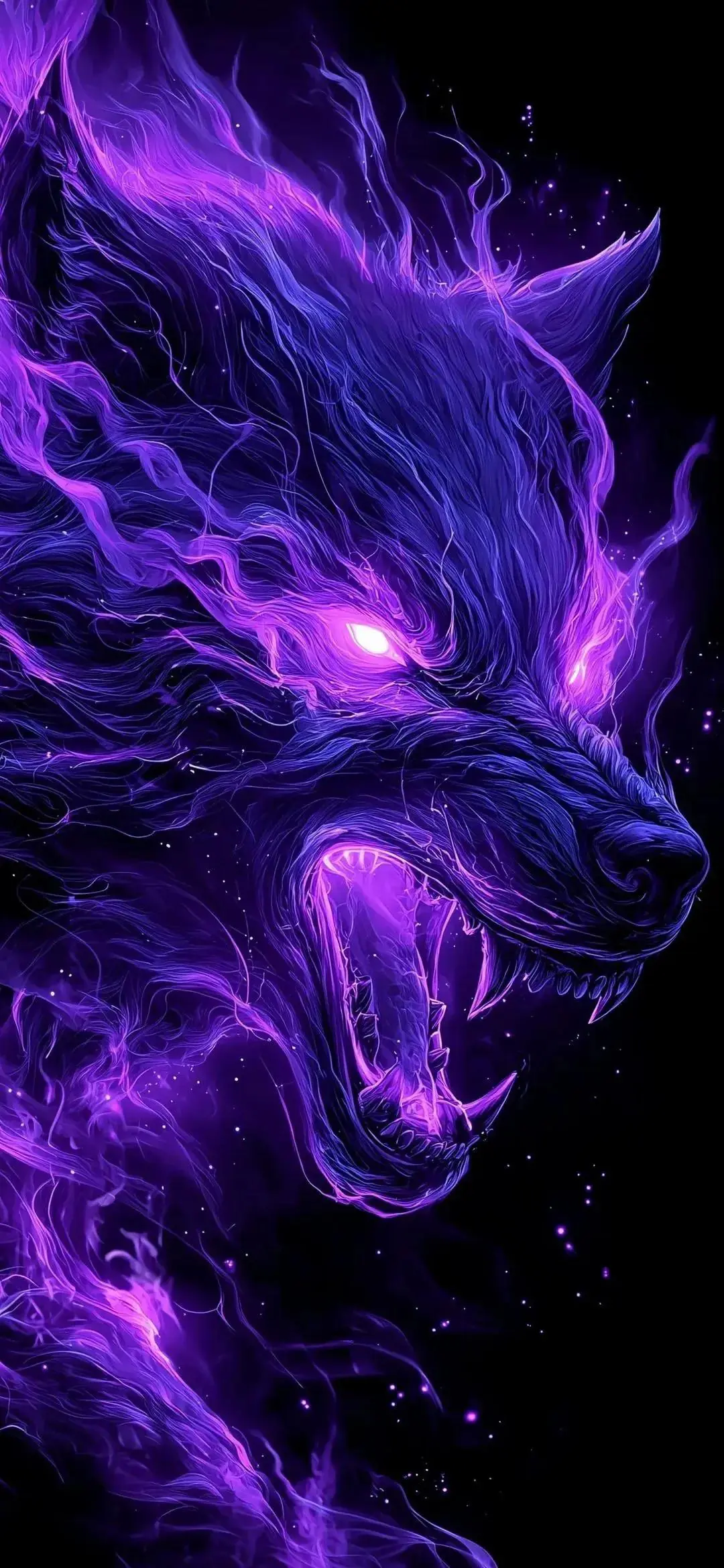 A fierce, snarling wolf rendered entirely in flowing neon purple [...]