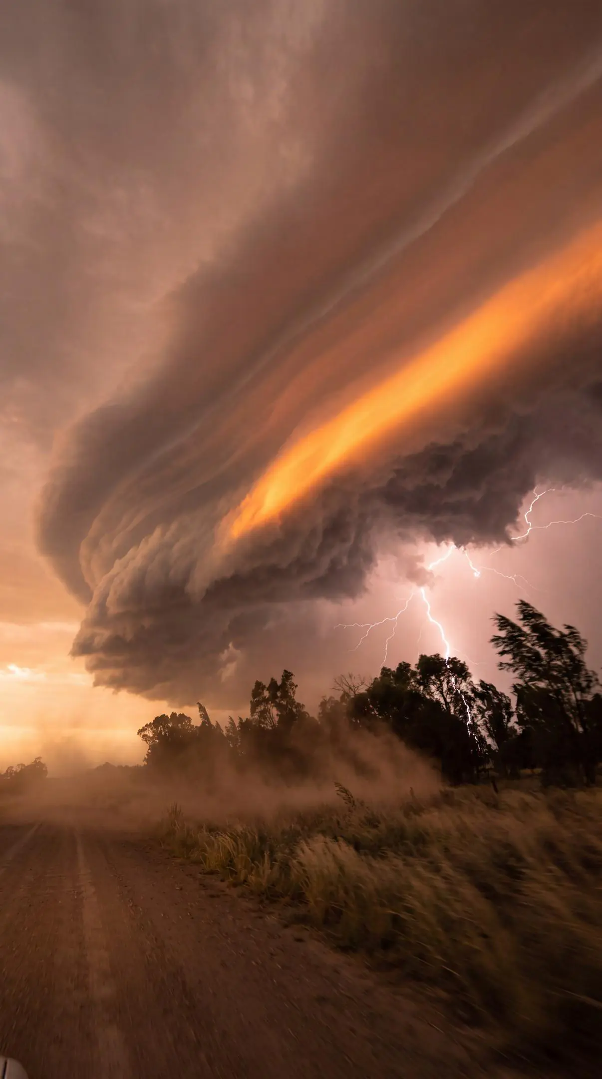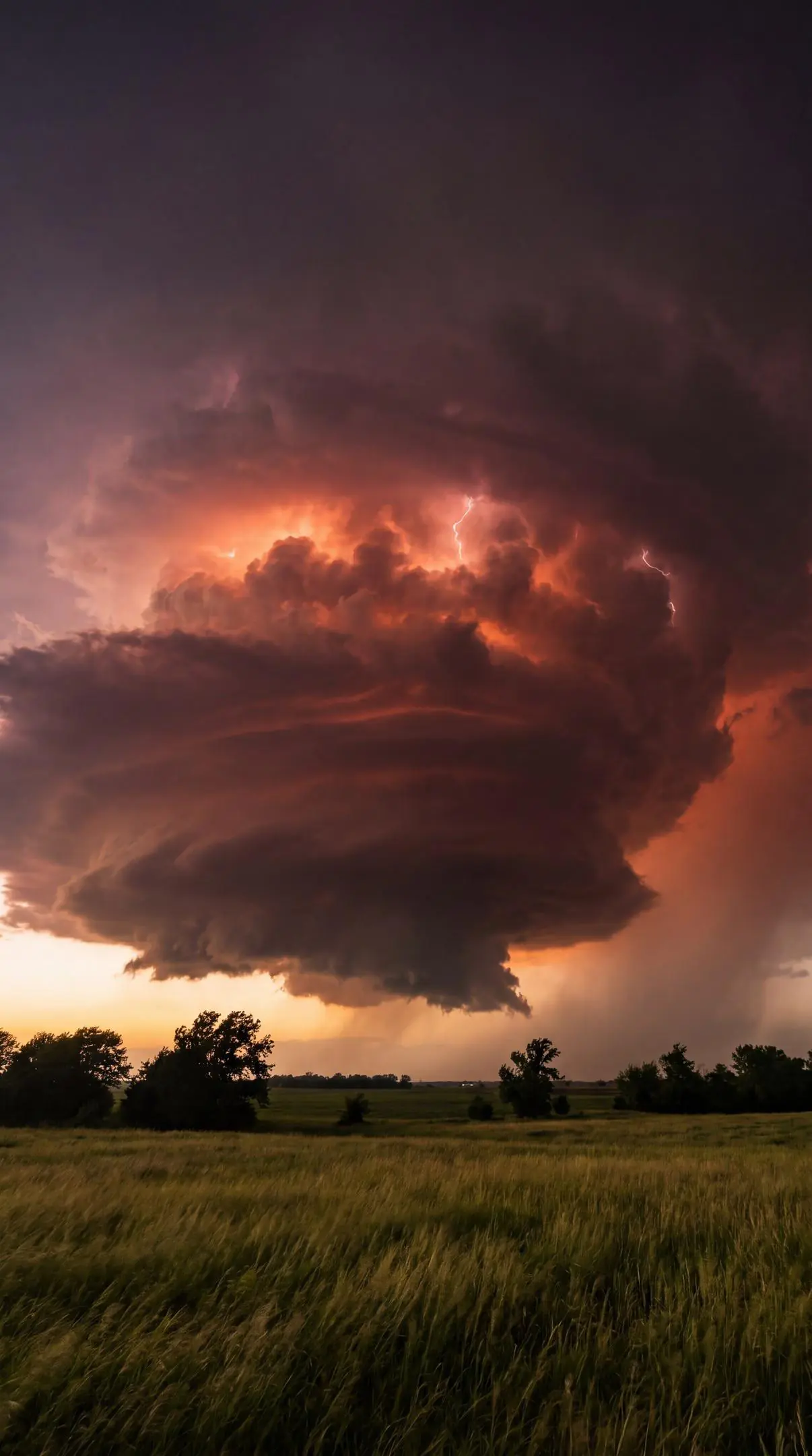 A massive rotating supercell thunderstorm dominates the sky, its layered [...]