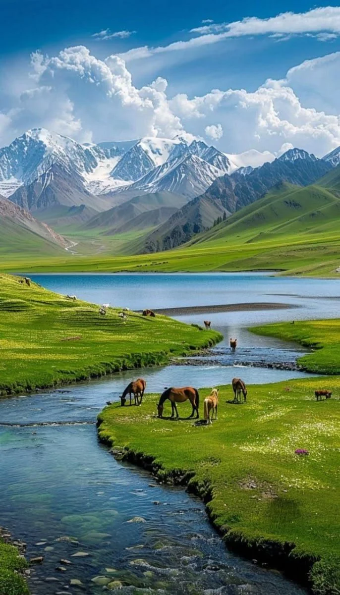 A postcard-perfect alpine valley scene with brown and chestnut horses [...]
