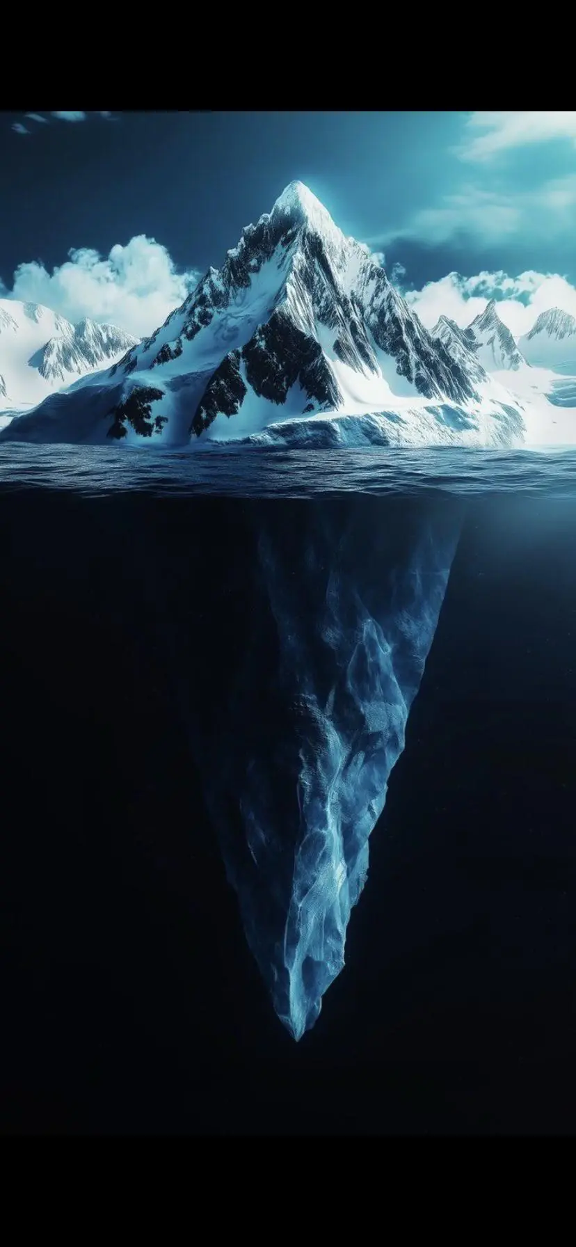 A dramatic split-view composition revealing a massive mountain-sized iceberg both [...]