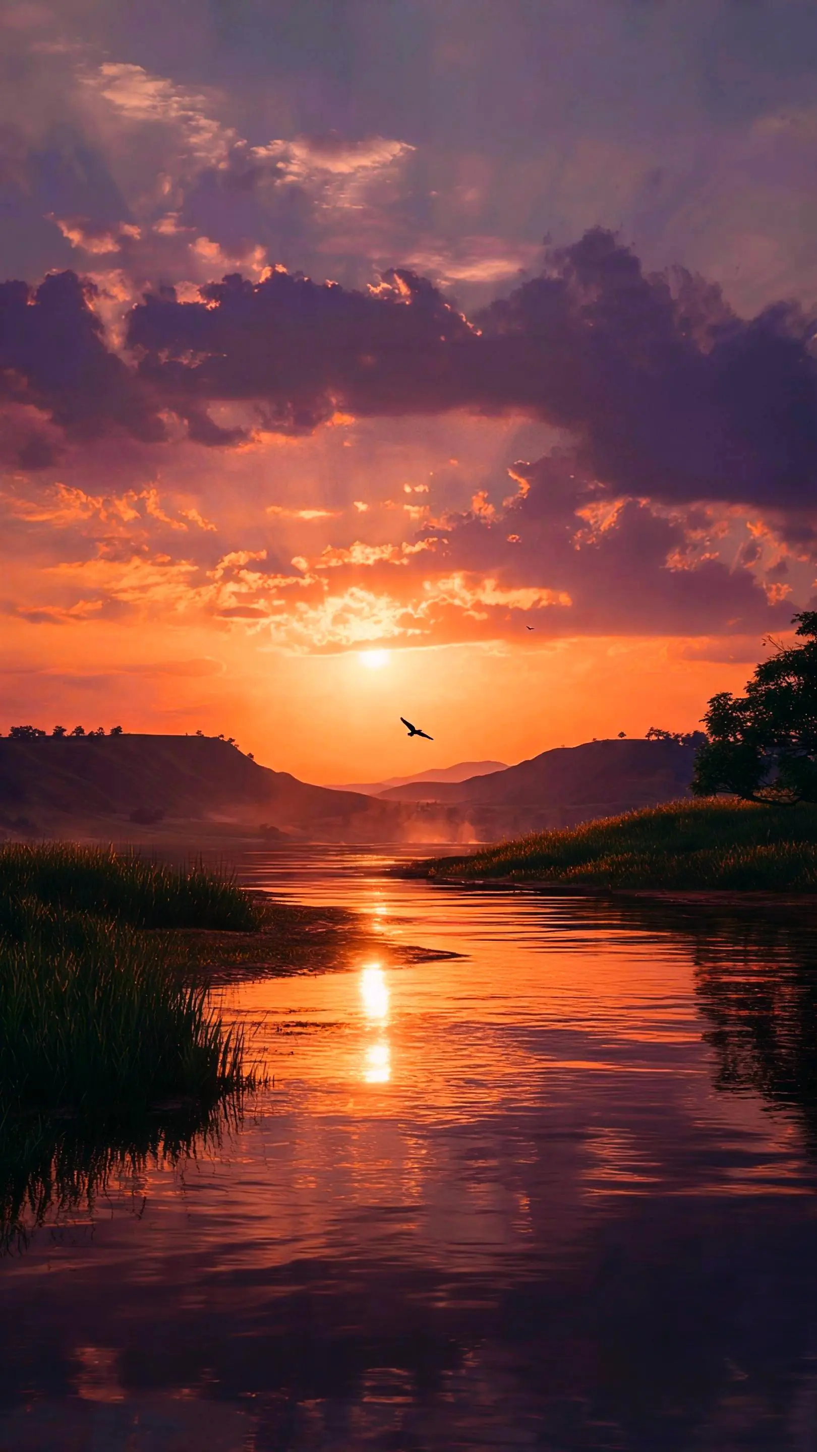 A serene river reflects a spectacular orange and purple sunset [...]