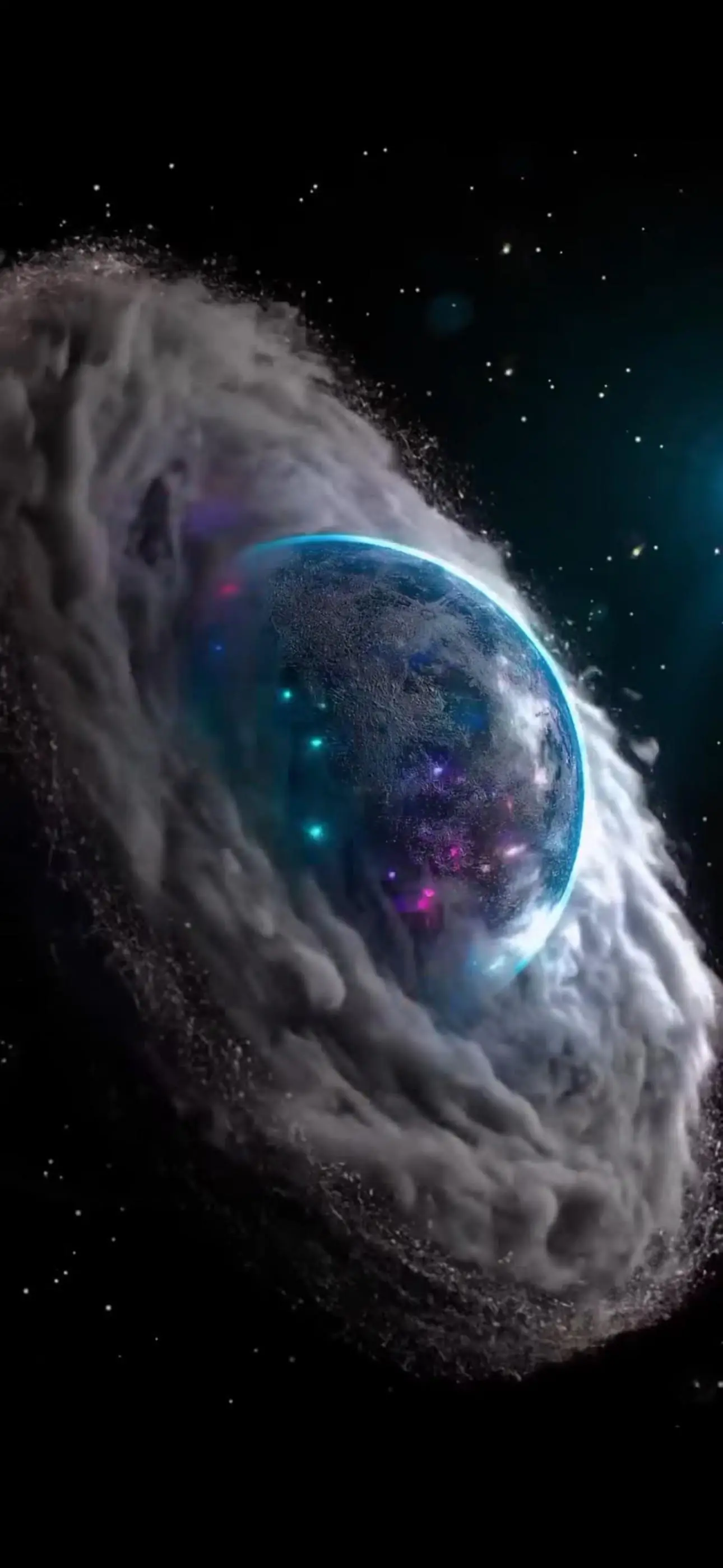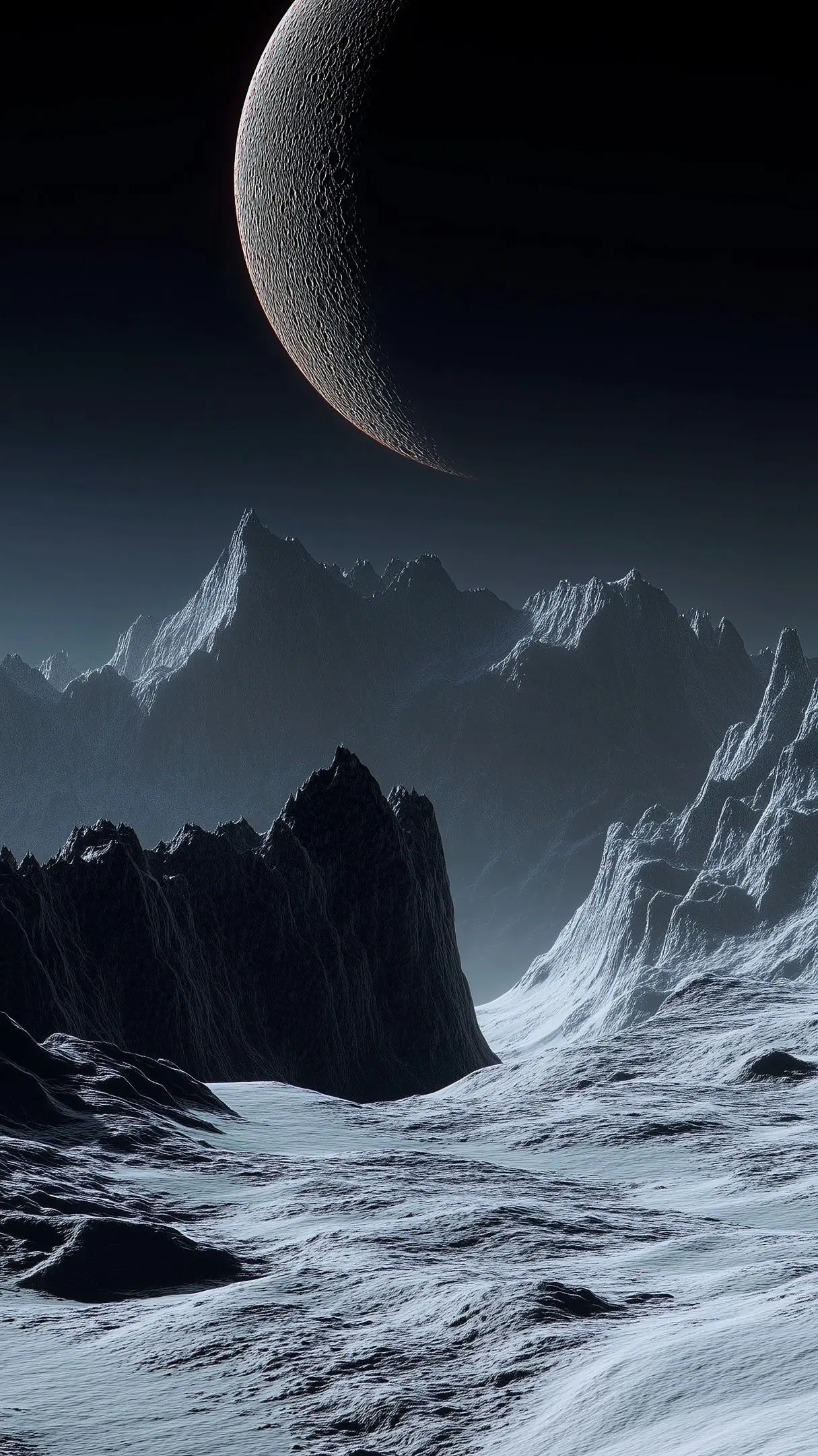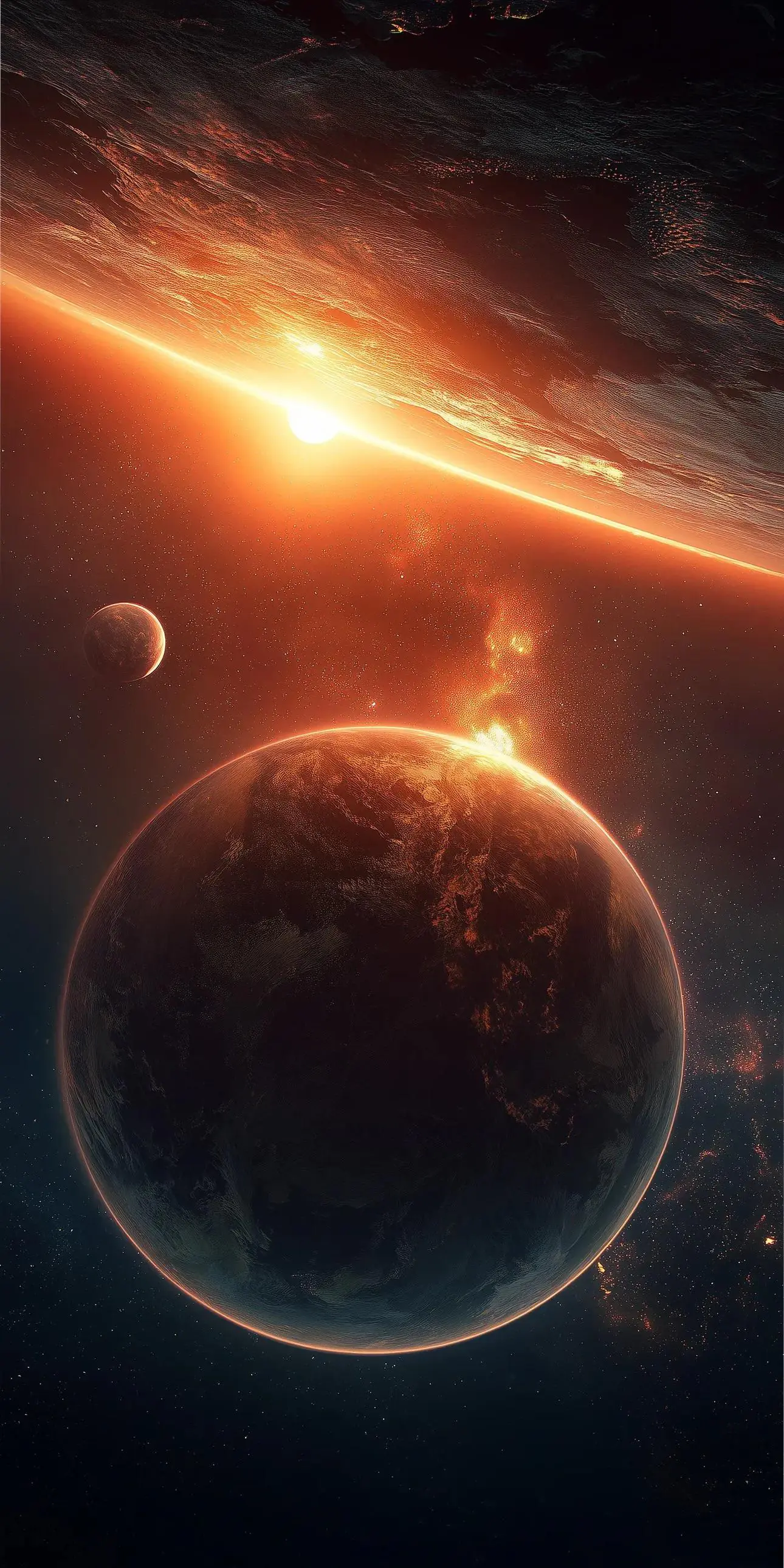 A dramatic space vista showing a dark terrestrial planet illuminated [...]