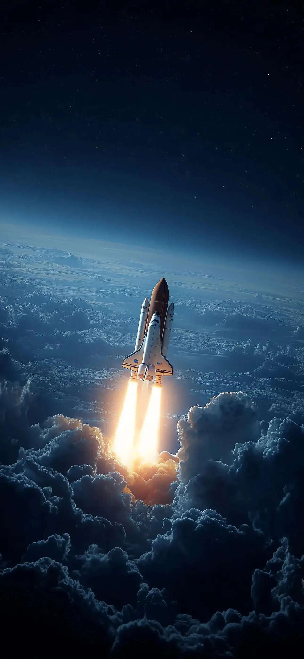 A space shuttle blasts through dramatic storm clouds, twin rocket [...]