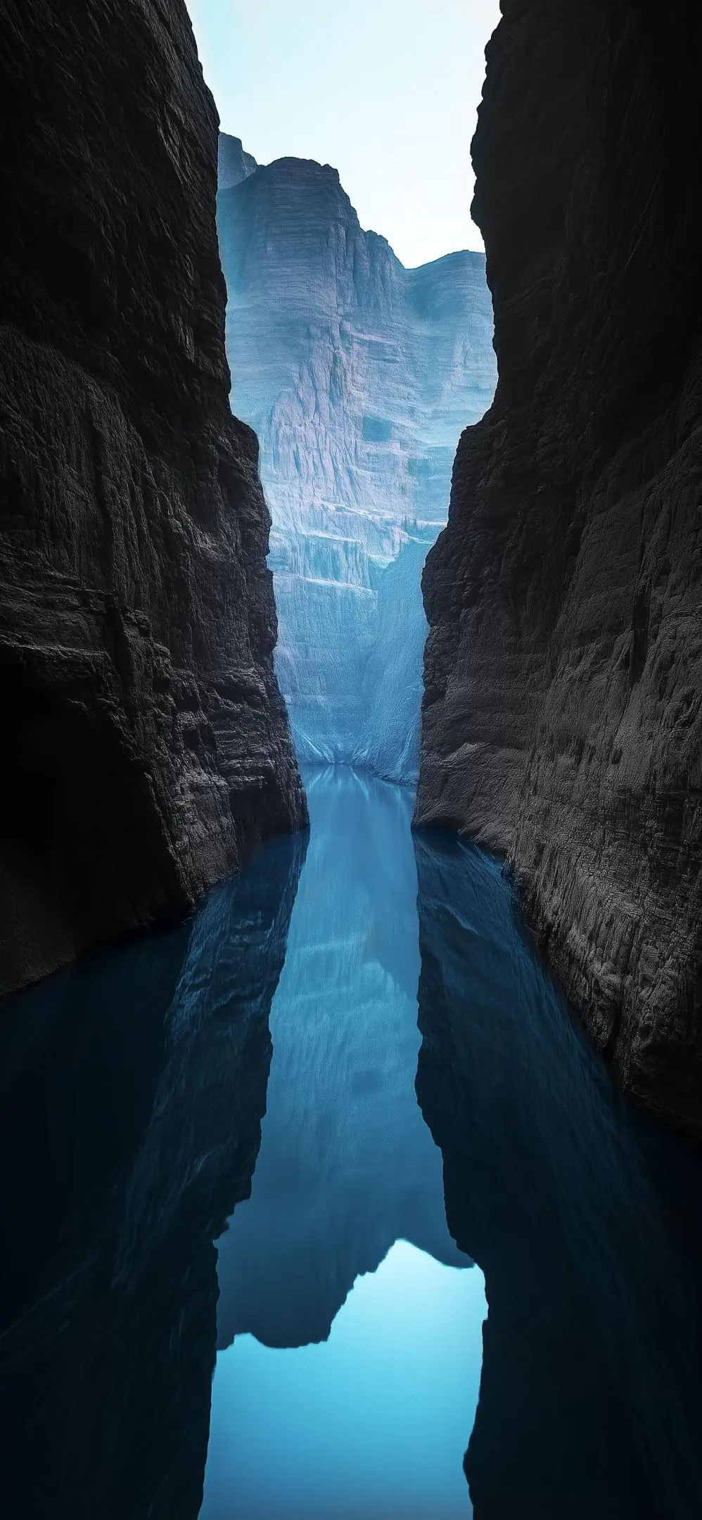 A narrow canyon corridor carved between towering dark cliffs opens [...]