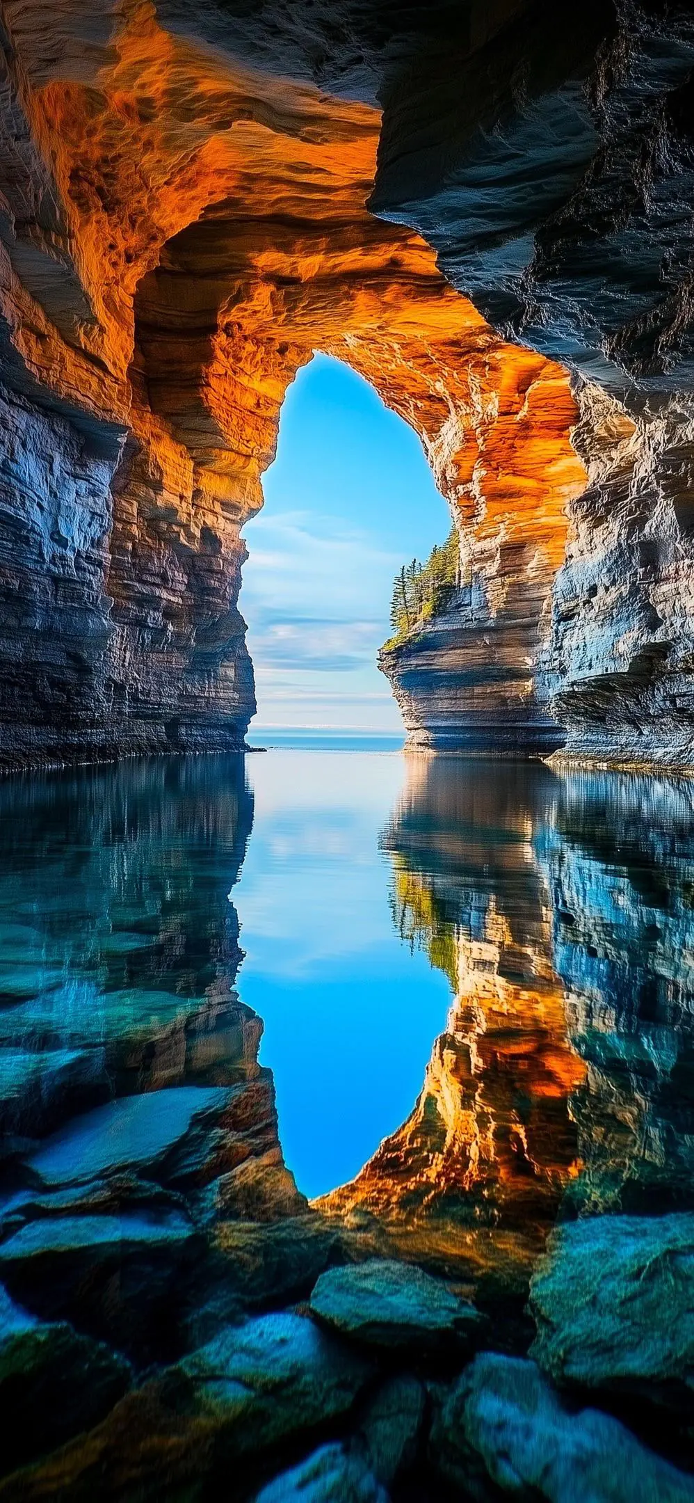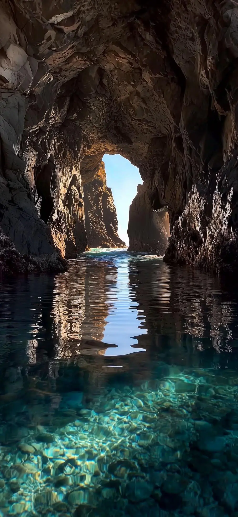 Inside a dark sea cave tunnel, layered rock walls frame [...]